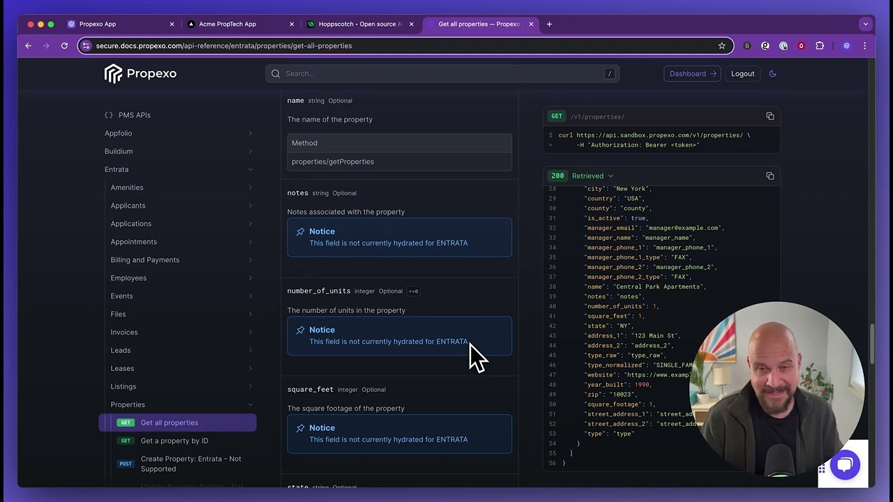 I’ve prepared an initial call to the Propexo Sandbox API for properties data, and I have set up an integration with Entrata. When we make this call, we should see properties come in from Propexo that Propexo has retrieved from Entrata.